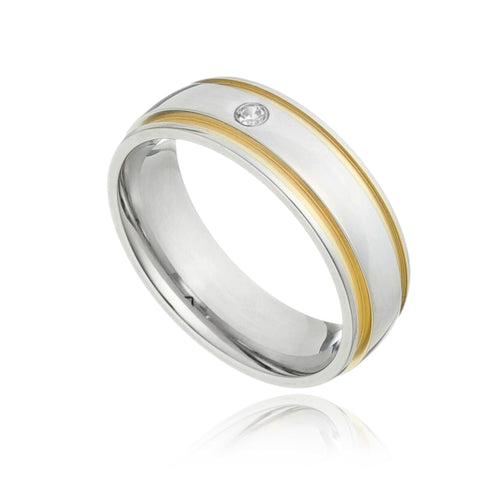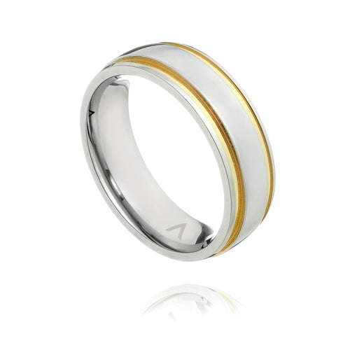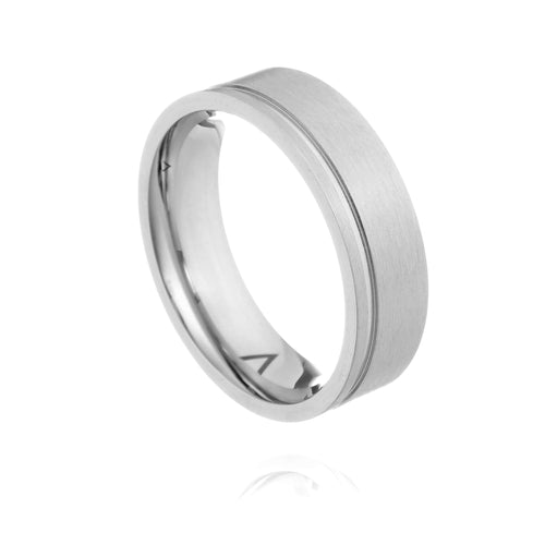 Aliança moderna com um toque de design industrial, com largura de 8 mm, detalhe de ranhura , adicionando profundidade e um elemento visual único de interior polido. Esta aliança é ideal para quem procura um estilo contemporâneo em aço cirúrgico com acabamento mate.