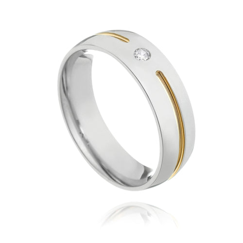 La alianza combina la elegancia del acero con un sutil toque dorado. La banda, de 6 mm de ancho, presenta una fina línea dorada que recorre su centro. Es el equilibrio perfecto entre modernidad y clasicismo, ofreciendo un toque de calidez y distinción en acero quirúrgico.